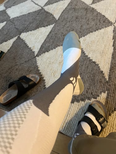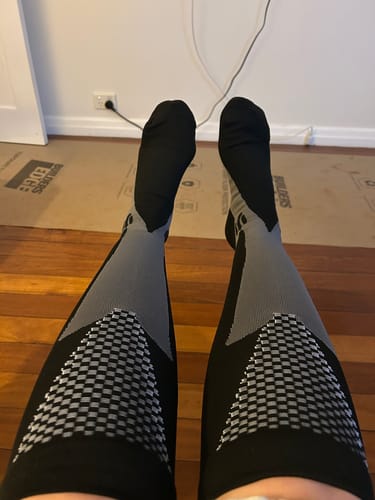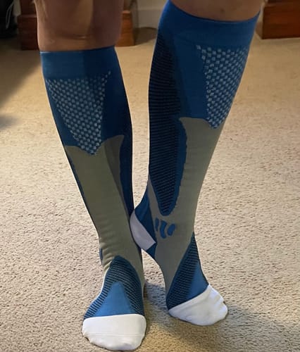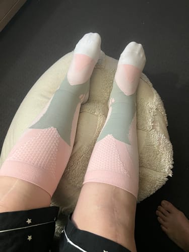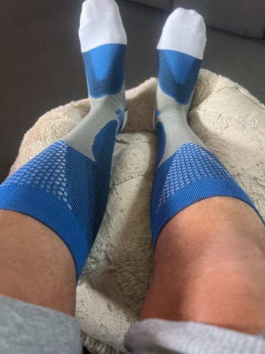 "Used to dread taking my shoes off because my feet would swell up like sausages. Started wearing UPR compression socks three weeks ago and wanted to test them. Look at the difference! I wore them only on my right leg and the difference is unbelievable. They really do work!!"